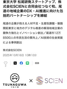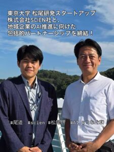 この度、東京大学 松尾研発スタートアップ、株式会社SCIEN (田端そら代表、写真左側)と、弊社(つなぐ和)とは、尾道の地域企業のDX・AI推進に向けた包括的パートナーシップを締結しました。