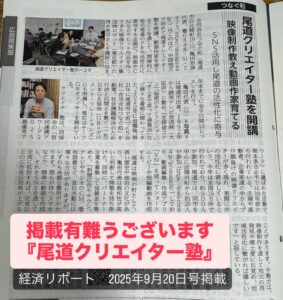 2025.09.22 未分類 経済リポート掲載『尾道クリエイター塾』 私が招聘して開講したきっかけなどを経済リポートさんが記事にしてくださいました。 誠に有難うございます。 Post Share RSS feedly Pin it 未分類 #尾道, #クリエイター塾, #尾道クリエイター塾, #映像クリエイター, #経済リポート がん啓発サポートキャンペーン前の記事 『命を守れ。―南海トラフ巨大地震に対する心構えや知識を…次の記事